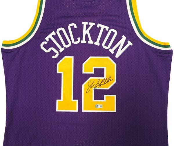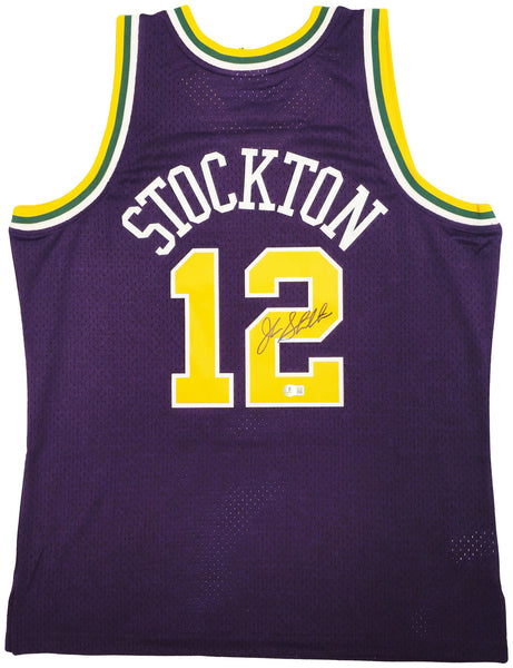 JAZZ JOHN STOCKTON AUTOGRAPHED PURPLE M&N 1991-92 JERSEY XL BECKETT 224355