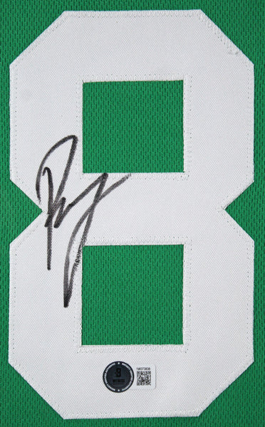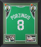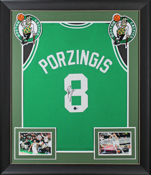This Autographed Green Pro Style Framed Jersey has been Personally Signed by Kristaps Porzingis of the Boston Celtics. This item is 100% Authentic to include a hologram by Beckett Authentication Services. This item will come with an affixed Beckett Authentication Services (BAS) authentication sticker, which includes a scannable QR code to verify authenticity. Please note that Beckett no longer provides serial-numbered COA cards, and the attached BAS sticker will serve as the complete authentication for this item. This is a BAS Witnessed Protection Program item which means a Beckett Authentication Service representative was present when this item was being signed. We have multiples of this same item. While the photographs are representative of this item, the size, placement and strength of the signature may vary. Each item is hand signed, therefore, each autograph is unique. This item has been professionally framed to overall dimensions of approximately 32 x 37 inches. This is a X-Large sized, non-branded, custom-stitched Framed Jersey. This jersey will be framed to order, it will take 3-4 days from purchase date for it to ship.