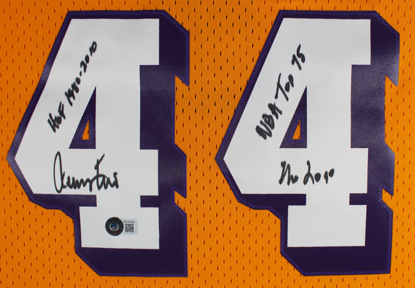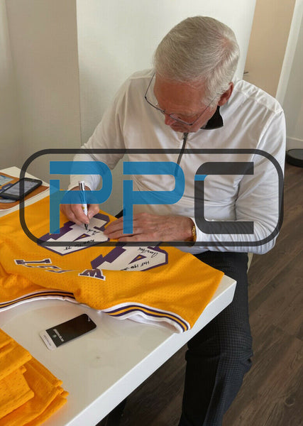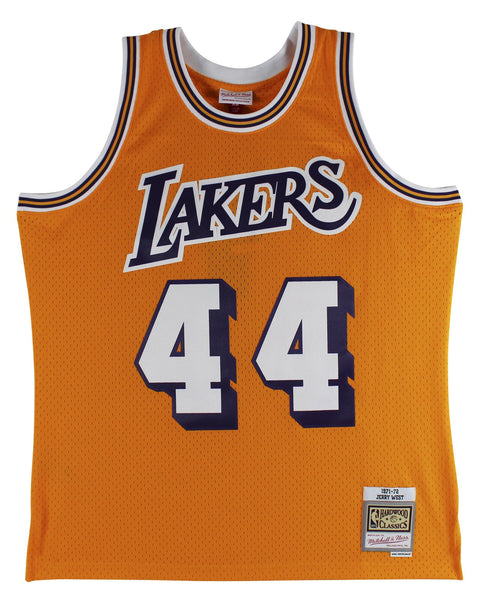 This Autographed Yellow Mitchell & Ness Hardwood Classics Swingman Jersey with the inscription of "HOF 1980-2010, NBA Top 75, The Logo" has been Personally Signed by Jerry West of the Los Angeles Lakers. This item is 100% Authentic to include a Certificate of Authenticity (COA) / hologram by Beckett Authentication Services. We conducted an autograph signing with Jerry West where multiples of the same item were signed. While the photographs are representative of this item, the size, placement and strength of the signature may vary. Each item is hand signed, therefore, each autograph is unique. This item can be verified through BAS. This is a X-Large sized Jersey.