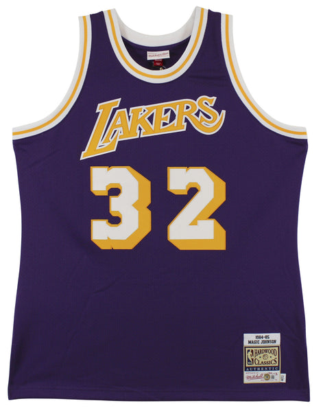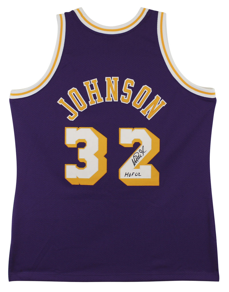 This Autographed 1984-85 Mitchell & Ness Hardwood Classics Authentic Purple Jersey with the inscription of "HOF 02" has been Personally Signed by Magic Johnson of the Los Angeles Lakers. This item is 100% Authentic to include a hologram by Beckett Authentication Services. This item will come with an affixed Beckett Authentication Services (BAS) authentication sticker, which includes a scannable QR code to verify authenticity. Please note that Beckett no longer provides serial-numbered COA cards, and the attached BAS sticker will serve as the complete authentication for this item. This is a BAS Witnessed Protection Program item which means a Beckett Authentication Service representative was present when this item was being signed. We conducted an autograph signing with Magic Johnson where multiples of the same item were signed. While the photographs are representative of this item, the size, placement and strength of the signature may vary. Each item is hand signed, therefore, each autograph is unique. This item can be verified through BAS Witnessed. This is a X-Large sized Jersey.