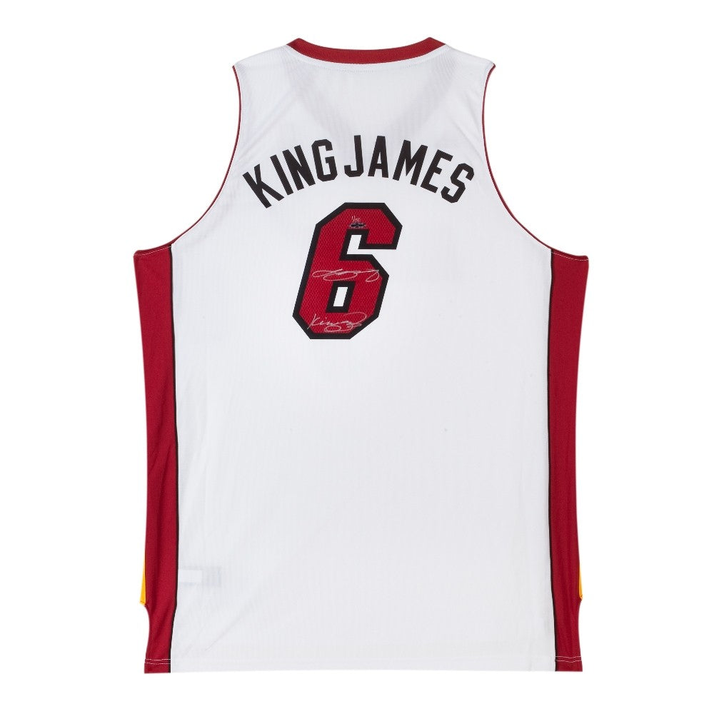 The Miami Heat has several players on their roster that are known around the league by a nickname. These players include Chris "Birdman" Anderson, Ray "Jesus Shuttlesworth" Allen, and Norris "Cole Train" Cole to name a few. The Heats best player, LeBron James has gone by the nickname "King James" for close to a decade now. The NBA and the Miami Heat introduced a new alternative nickname uniform during the 2013-14 NBA season. James has signed and inscribed "King James" on this limited edition (50) swingman Adidas No. 6 Miami Heat "King James" nickname jersey in silver paint pen. His signature is deemed 100% authentic by virtue of Upper Deck Authenticated's Five-Step Process.
