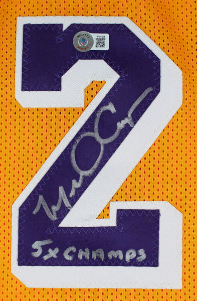 This Autographed Yellow Pro Style Jersey with the inscription of "5x Champs" has been Personally Signed by Michael Cooper of the Los Angeles Lakers. This item is 100% Authentic to include a hologram by Beckett Authentication Services. This item will come with an affixed Beckett Authentication Services (BAS) authentication sticker, which includes a scannable QR code to verify authenticity. Please note that Beckett no longer provides serial-numbered COA cards, and the attached BAS sticker will serve as the complete authentication for this item. This is a BAS Witnessed Protection Program item which means a Beckett Authentication Service representative was present when this item was being signed. We conducted an autograph signing with Michael Cooper where multiples of the same item were signed. While the photographs are representative of this item, the size, placement and strength of the signature may vary. Each item is hand signed, therefore, each autograph is unique. This item can be verified through BAS Witnessed. This is a X-Large sized, non-branded, custom-stitched Jersey.