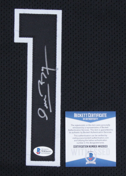 Custom on-court style jersey. Everything sewn on, size XL. Hand-signed by Muggsy Bogues (Charlotte Hornets).The lot / autograph(s) includes an official Beckett Authentication Services serially-numbered hologram and matching COA for authenticity purposes. The signing of this item was witnessed by Beckett.Authentication: Beckett COA