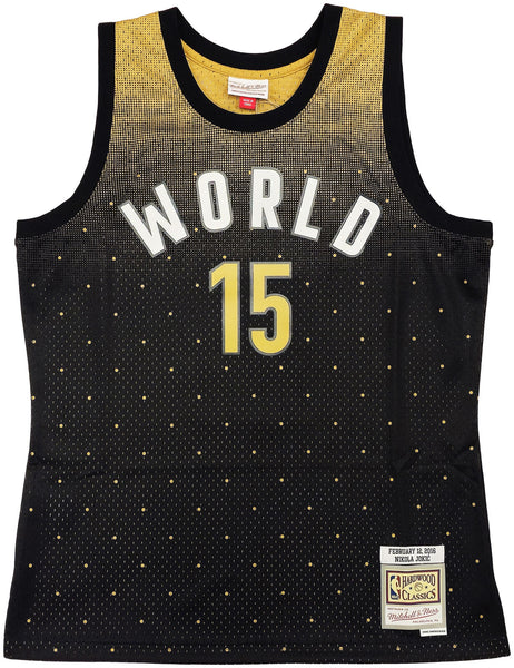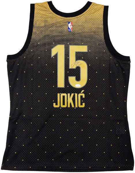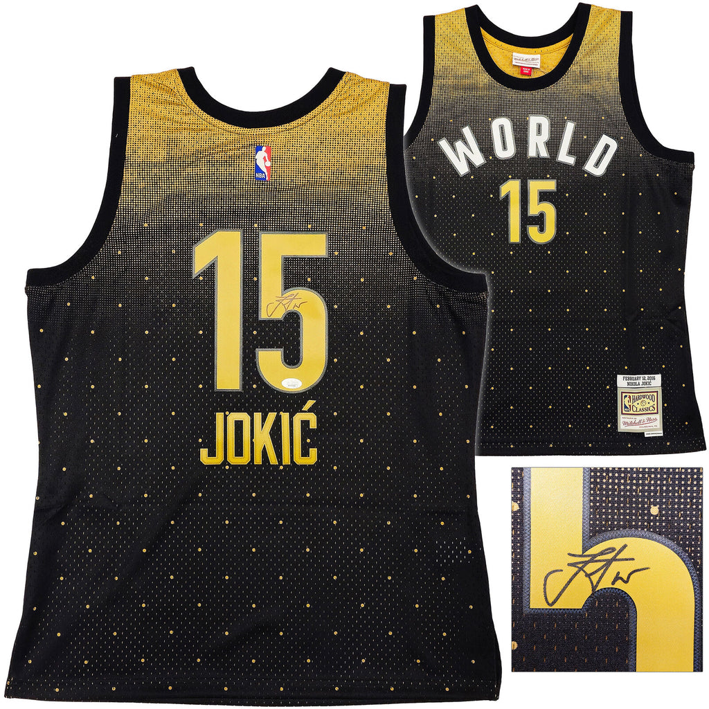 This is a Black Authentic Mitchell & Ness Denver Nuggets HWC Swingman 2016 All Star Game World Jersey that has been hand signed by Nikola Jokic. This jersey is Size L. This item has been certified authentic by JSA and comes with their tamper-proof hologram and matching certificate of authenticity.