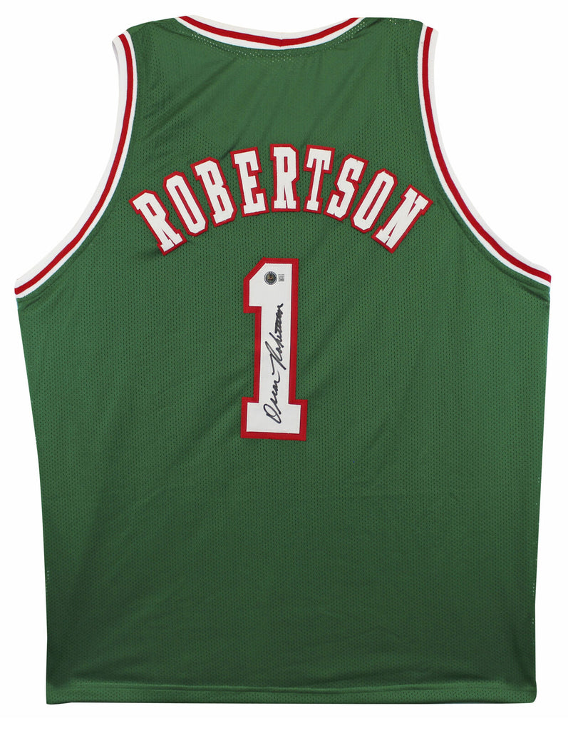 This Autographed Green Pro Style Jersey has been Personally Signed by Oscar Robertson of the Milwaukee Bucks. This item is 100% Authentic to include a hologram by Beckett Authentication Services. This item will come with an affixed Beckett Authentication Services (BAS) authentication sticker, which includes a scannable QR code to verify authenticity. Please note that Beckett no longer provides serial-numbered COA cards, and the attached BAS sticker will serve as the complete authentication for this item. This is a BAS Witnessed Protection Program item which means a Beckett Authentication Service representative was present when this item was being signed. We conducted an autograph signing with Oscar Robertson where multiples of the same item were signed. While the photographs are representative of this item, the size, placement and strength of the signature may vary. Each item is hand signed, therefore, each autograph is unique. This item can be verified through BAS Witnessed. This is a X-Large sized, non-branded, custom-stitched Jersey.