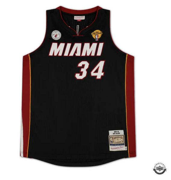 Ray Allen spent the twilight of his career with a Miami Heat team that was one of the best NBA teams ever assembled, and he had what was the defining single moment of his career. The world-class three-point shooter joined the defending champions going into the 2012-13 season and helped lead them back to the NBA Finals. The Heat found themselves trailing the San Antonio Spurs 3-2 in the series heading into Game 6 and were on the brink of elimination as San Antonio had a 95-92 lead as time was winding down in the fourth quarter. Allen received a pass in the corner and drained a three-pointer to tie the game and send it into overtime. The Heat would win the game 103-100 in overtime and sealed it when Allen came up with a clutch steal leading to two free throws. This was Allen's second career NBA Title and will be forever remembered because of his important shot.This jersey is autographed and inscribed by Ray Allen. Allen's signature and inscription were witnessed by an Upper Deck representative as part of UDA's 5-step authentication process. Includes tamper-evident hologram to ensure authenticity Officially licensed This product is guaranteed authentic and includes an Upper Deck Authenticate Certificate of Authenticity and an accompanying tamper-evident UDA Hologram.