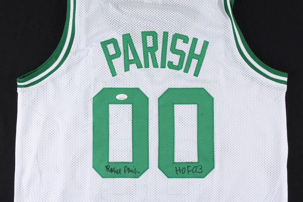 Custom on-court style jersey. Everything is sewn on, size XL. Hand-signed and inscribed in black felt-tip pen by Robert Parish (HOF). The lot / autograph(s) includes an official James Spence Authentication (JSA) hologram and matching COA for authenticity purposes. The signing of this item was witnessed by JSA.Authentication: JSA COA