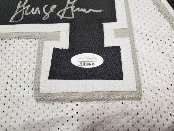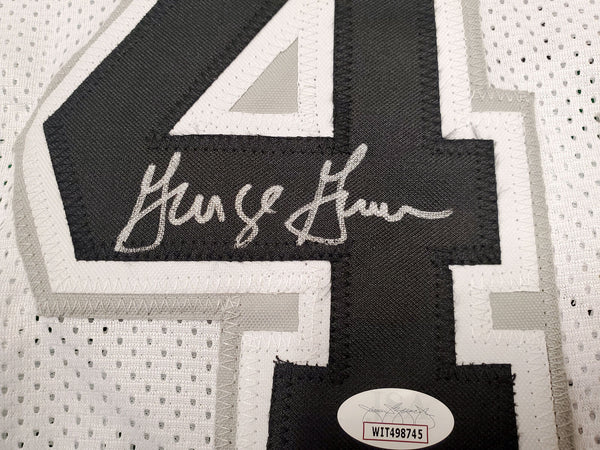 This is a White Jersey that has been hand signed by George Gervin. This is a custom jersey with no name brand. The approximate size is XL. It has nice sewn in name and numbers. This item has been certified authentic by JSA and comes with their tamper-proof sticker and matching certificate of authenticity.