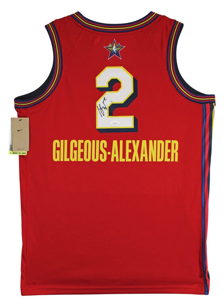 This Autographed Red All Star Game Nike Jordan Swingman Jersey has been Personally Signed by Shai Gilgeous-Alexander of the Oklahoma City Thunder. This item is 100% Authentic to include a Certificate of Authenticity (COA) / hologram by JSA. The authenticity can be verified on JSA website. This is a Large sized Jersey.