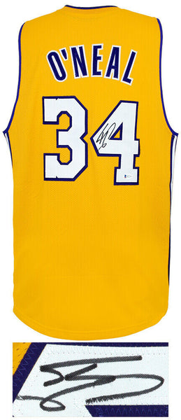 Shaquille O'Neal signed gold custom basketball jersey. Item comes with a Beckett Authentication tamper evident numbered sticker and matching Certificate of Authenticity which can be verified online. Jersey is size XL.