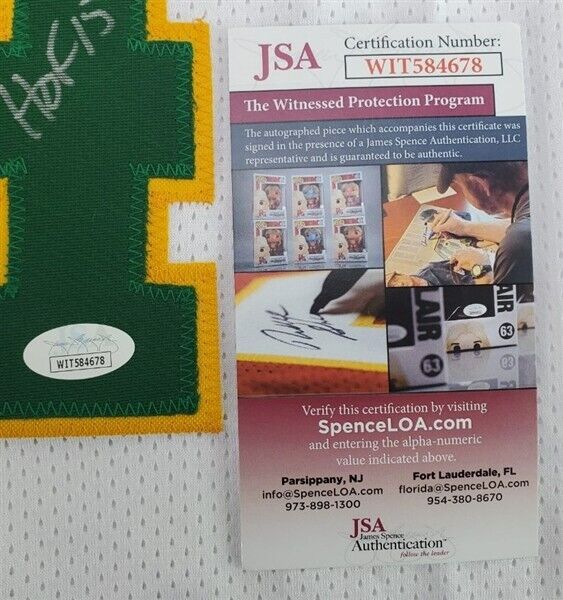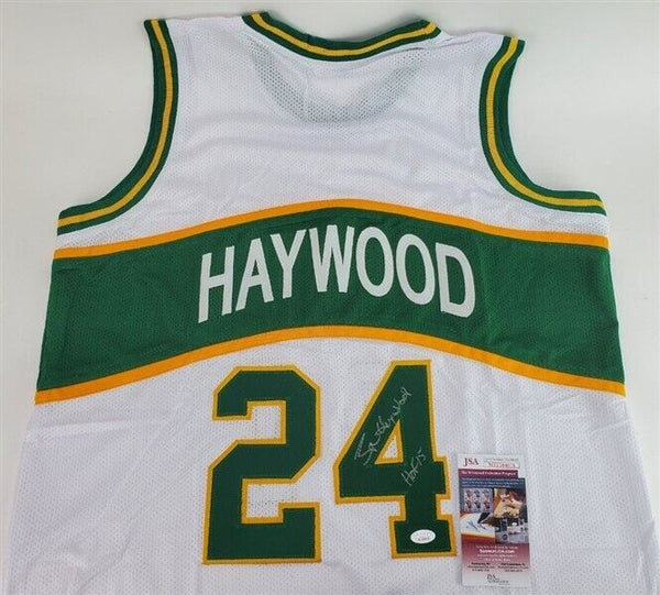 This autographed jersey has been personally hand-signed by Spencer Haywood of the Seattle Supersonics. Haywood added the inscription "HOF 15" along with his signature. This autograph is certified by James Spence Authentication's (JSA) Witnessed Protection Program. That means that a JSA representative was present when this item was signed. It comes with the numbered hologram and matching Certificate of Authenticity.Custom on-field style jerseys are a more affordable option for autograph seekers. These jerseys do not have any brand name or tags and are made in the Philippines. They feature stitched on names and numbers and are made to look very similar to the on-field jerseys that the players wear. These custom jerseys are very commonly used in the memorabilia industry.