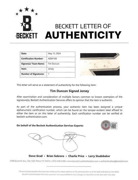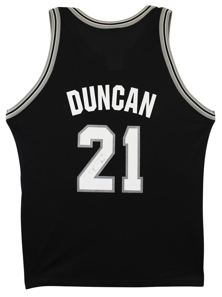 This Autographed Black Champion Size 48 Jersey has been Personally Signed by Tim Duncan of the San Antonio Spurs. This item is 100% Authentic to include a Certificate of Authenticity (COA) / hologram by Beckett Authentication Services. The authenticity can be verified on Beckett Authentication Services website.