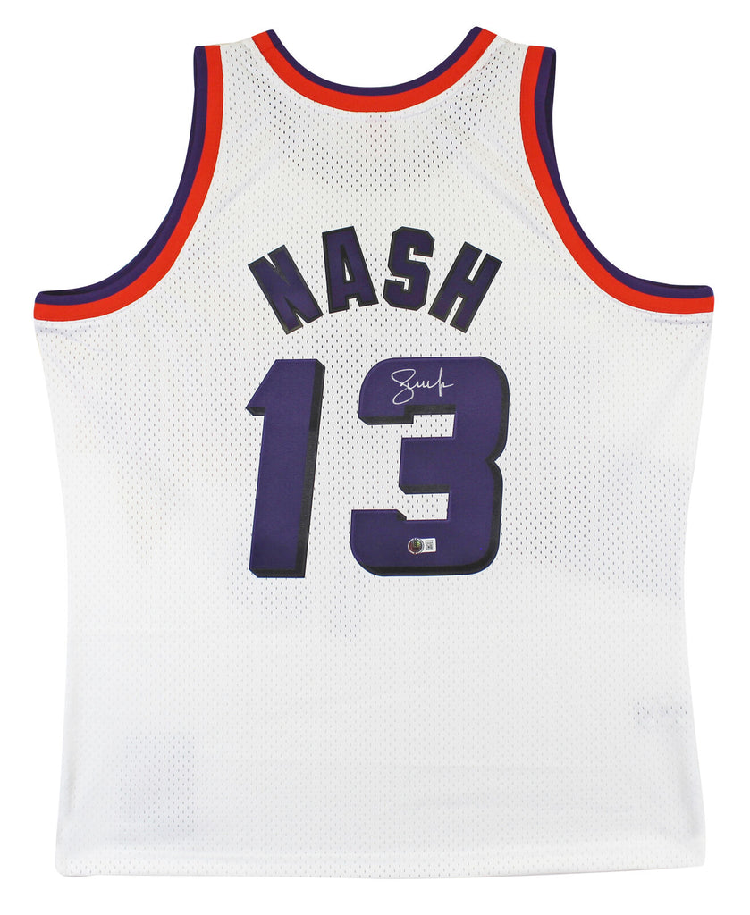 This Autographed White Mitchell & Ness 1996-97 Hardwood Classics Swingman Jersey has been Personally Signed by Steve Nash of the Phoenix Suns. This item is 100% Authentic to include a hologram by Beckett Authentication Services. This item will come with an affixed Beckett Authentication Services (BAS) authentication sticker, which includes a scannable QR code to verify authenticity. Please note that Beckett no longer provides serial-numbered COA cards, and the attached BAS sticker will serve as the complete authentication for this item. This is a BAS Witnessed Protection Program item which means a Beckett Authentication Service representative was present when this item was being signed. We conducted an autograph signing with Steve Nash where multiples of the same item were signed. While the photographs are representative of this item, the size, placement and strength of the signature may vary. Each item is hand signed, therefore, each autograph is unique. This item can be verified through BAS Witnessed. This is a X-Large sized Jersey.
