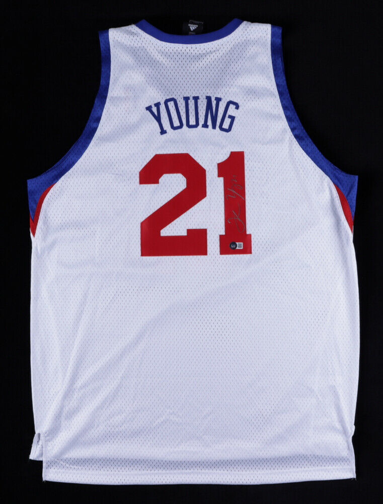 Custom on-court style jersey. Everything sewn on, XL. Has been hand-signed by Thaddeus Young(Philadelphia 76ers).The lot / autograph(s) includes an official Beckett Authentication Services serially-numbered hologram and matching COA for authenticity purposes.Authentication: Beckett COA