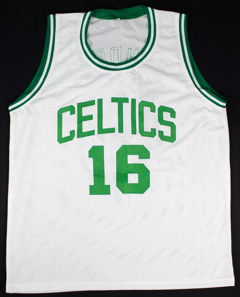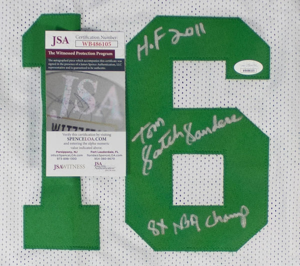 This autographed custom on-court style adult XL jersey has been personally hand-signed by Tom "Satch" Sanders of the Boston Celtics. When signing, Sanders also inscribed "HOF 2011" and "8x NBA Champ" along with his signature.This autograph is certified by James Spence Authentication's (JSA) Witnessed Protection Program. That means that a JSA representative was present when this item was signed. It comes with the numbered hologram and matching Certificate of Authenticity.Custom on-court style jerseys are a more affordable option for autograph seekers. These jerseys do not have any brand name or tags and are made in the Philippines. They feature stitched on names and numbers and are made to look very similar to the on-field jerseys that the players wear. These custom jerseys are very commonly used in the memorabilia industry.