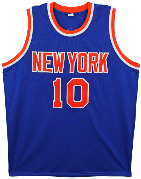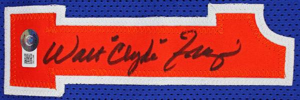 This Autographed Blue Pro Style Jersey has been Personally Signed by Walt Frazier of the New York Knicks. This item is 100% Authentic to include a hologram by Beckett Authentication Services. This item may come with the new Beckett Authentication hologram that has a scannable QR code rather than the traditional COA. If you would like to have a COA, you are welcome to reach out to Beckett for a printed certification once you receive your item. This is a BAS Witnessed Protection Program item which means a Beckett Authentication Service representative was present when this item was being signed. We conducted an autograph signing with Walt Frazier where multiples of the same item were signed. While the photographs are representative of this item, the size, placement and strength of the signature may vary. Each item is hand signed, therefore, each autograph is unique. This item can be verified through BAS Witnessed. This is a X-Large sized, non-branded, custom-stitched Jersey.