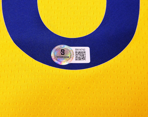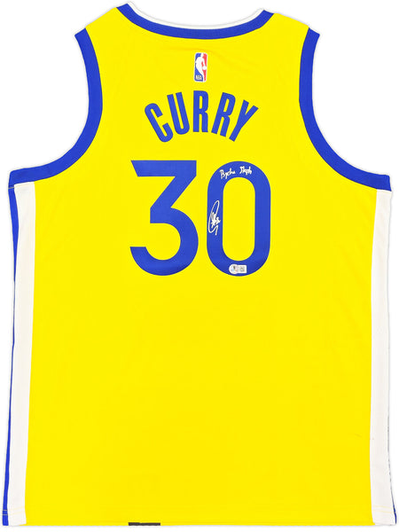 This is a Yellow Nike Golden State Warriors Swingman Jersey that has been hand signed by Stephen Curry. This jersey is Size 48. This item was inscribed "Psycho Steph." This item has been certified authentic by Beckett Authentication (BAS) and comes with their tamper-proof hologram.