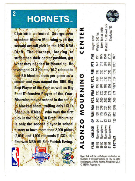 Alonzo Mourning signed Charlotte Hornets 1992-93 Upper Deck rookie basketball card #393. Item comes with a Schwartz Sports Memorabilia tamper-proof numbered hologram (on back of physical card) and Certificate of Authenticity which can be verified online.
