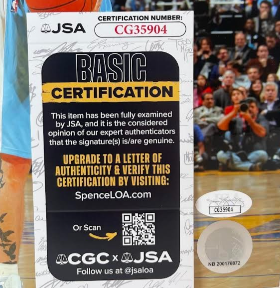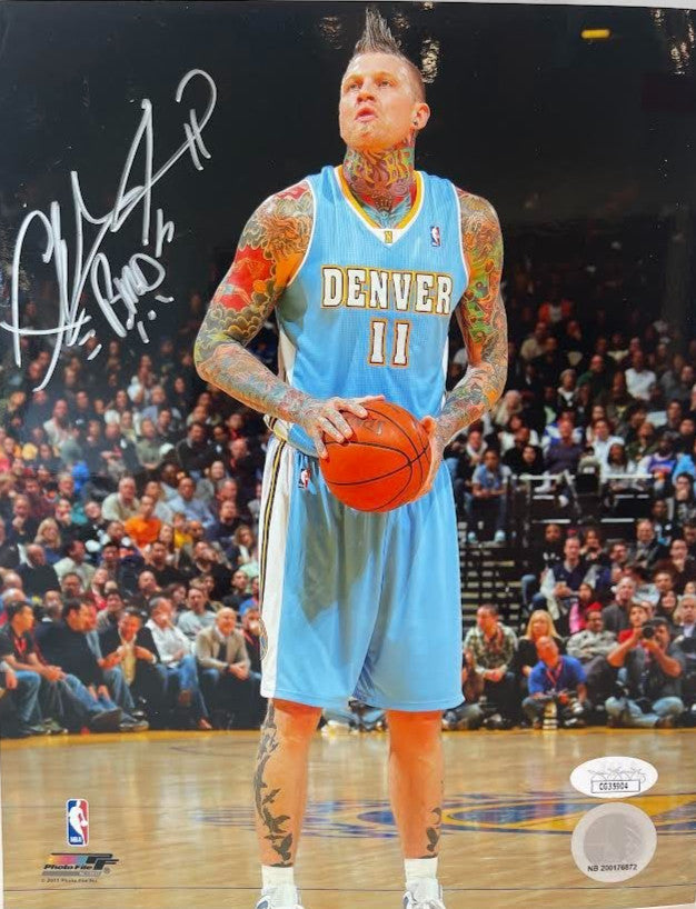 The product is an autographed 8x10 photo of Chris Andersen, also known as "Birdman," from the Denver Nuggets. The photo is authenticated by James Spence Authentication (JSA) and features an inscription of "Bird." This collectible item would be a valuable addition for any basketball fan or memorabilia collector looking to own a piece of NBA history signed by a prominent player.