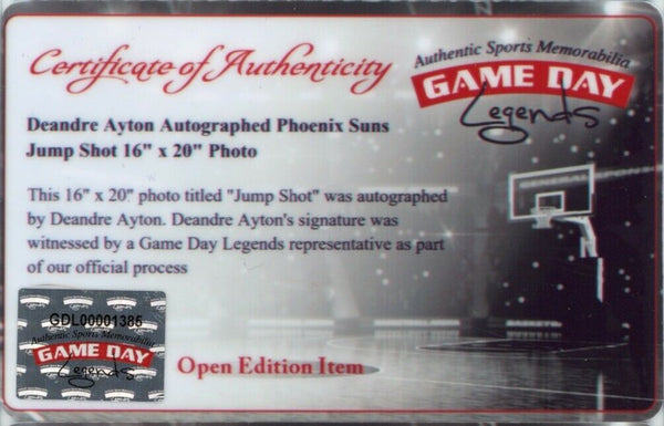 DEANDRE AYTON Autographed Phoenix Suns "Jump Shot" 16" x 20" Photograph - Super Sports Center & Steiner Sports Authenticated This photograph was autographed by Deandre Ayton. It is officially licensed by the National Basketball Association and comes with an individually numbered, tamper-evident hologram from Super Sports Center Authenticated as well as Steiner Sports Authentic. Your signed item can be identified and verified for authenticity by entering the serial number from your hologram into our online database. This process confirms and guarantees that your collectible is authentic and eliminates all possibility of duplication and fraud.This product is guaranteed authentic and includes a Super Sports Center Certificate of Authenticity and an accompanying tamper-evident hologram.