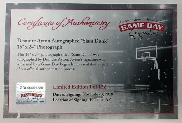 This photograph was autographed by Deandre Ayton. It is officially licensed by the National Basketball Association and comes with an individually numbered, tamper-evident hologram from Super Sports Center Authenticated as well as Steiner Sports Authentic. Your signed item can be identified and verified for authenticity by entering the serial number from your hologram into our online database. This process confirms and guarantees that your collectible is authentic and eliminates all possibility of duplication and fraud.This product is guaranteed authentic and includes a Super Sports Center Certificate of Authenticity and an accompanying tamper-evident hologram.