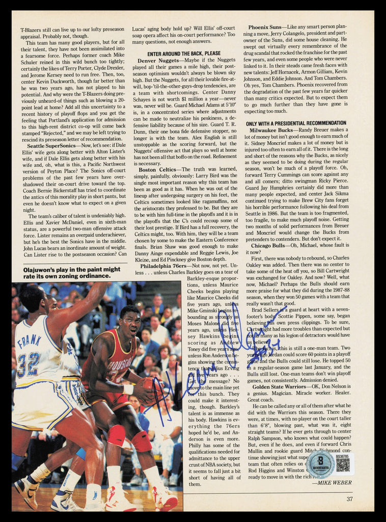This is an 8x11 Magazine Page Photo that has been hand signed by Hakeen Olajuwon. This item has been certified authentic by Beckett Authentication (BAS) and comes with their tamper-proof QR Code hologram.