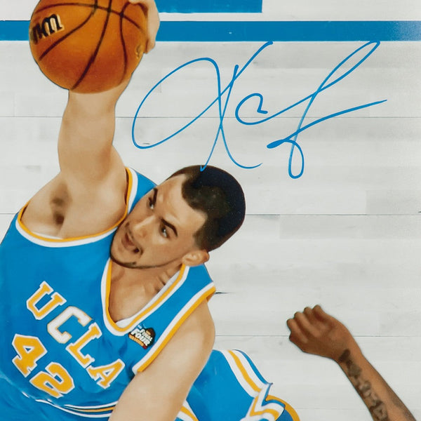 Whether he was an All-Star in Minnesota or an All-Star and NBA Finals champion in Cleveland, Kevin Love has always been strong and confident around the rim. Defensively, he boxes out and rebounds as well as any player in the league. Offensively, he can finish any number of ways, including dunking like in this image. That skillset around the rim didn't begin in the NBA. He developed it gradually throughout high school and then showcased it for the nation in his lone season at UCLA. The consensus All-America notched 23 double-doubles in that 2007-08 season as he teamed with Russell Westbrook to lead the Bruins to a Final Four appearance. He was selected fifth overall in the '08 NBA Draft. Love has signed this "Throwdown" 20" x 16" image in electric blue paint pen. His signature is deemed authentic by virtue of Upper Deck Authenticated's Five-Step Process.