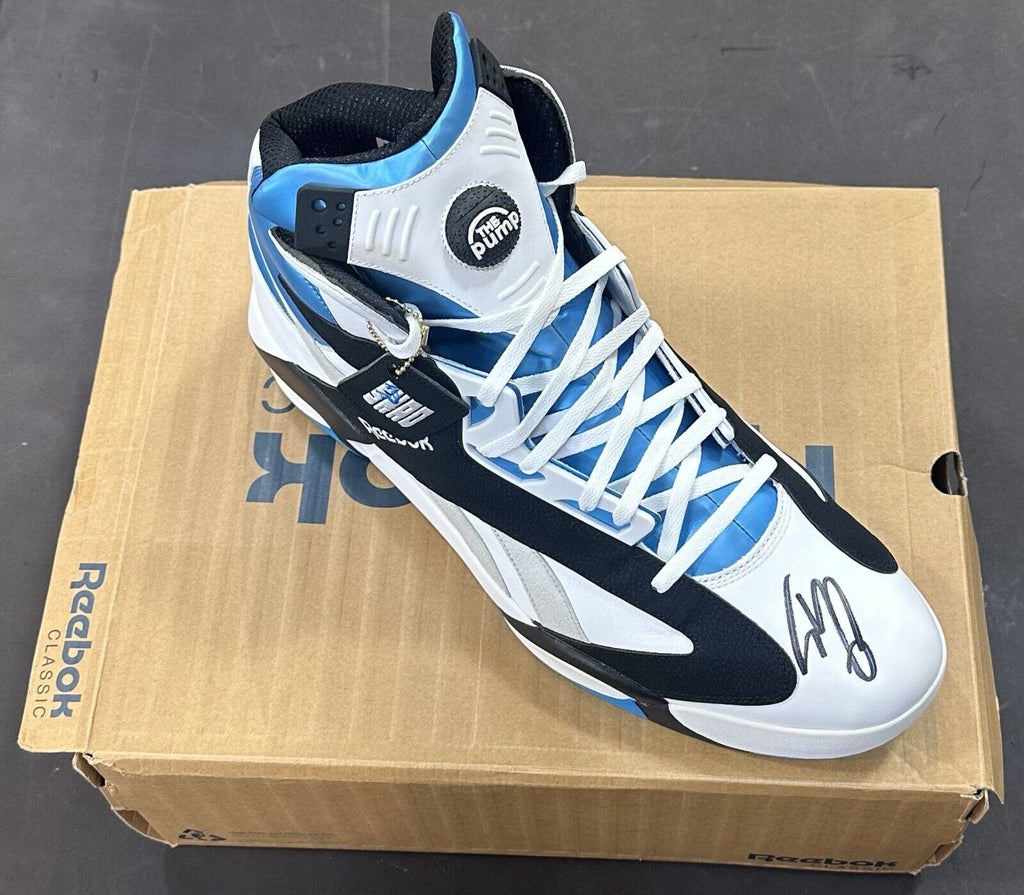 Shaquille O'Neal hand signed Reebok Shaq Attaq game model size 22 rookie sneaker. Hand signed in black on the toe of the sneaker. Comes with Shaq sneaker tag that we show! Insane rare size 22 sneaker of the Hall of Fame center Shaquille O'Neal. This is his rookie sneaker from when he was on the Orlando Magic. Beautiful light blue white and black right sneaker. The photos you see are of the actual sneaker you will receive!