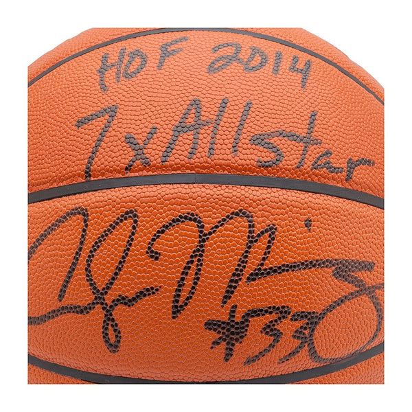 In typical Alonzo Mourning fashion, the 6-foot-10 center and NBA Finals champion didn't take much credit for his outstanding career during his Hall of Fame induction speech in 2014. Instead, he chose to thank and give credit to the people who helped to shape him into a man and one of the best centers to ever play the game. Tops on his list were Georgetown coach John Thompson, Miami Heat president Pat Riley and his cousin Jason Cooper, who donated a kidney to Mourning after Zo was diagnosed with inoperable kidney disease. Following a 15-year NBA career that included two Defensive Player of the Year awards (1999, 2000), seven All-Star Game appearances and a championship (2006), Mourning was selected to the Naismith Memorial Basketball Hall of Fame on the first ballot. The hand-written inscription on this basketball reads: "HOF 2014 7x All-Star." Alonzo Mourning has signed and inscribed this limited edition (33) Spalding indoor/outdoor basketball in black paint pen. His signature is deemed authentic by virtue of Upper Deck Authenticated's Five Step Process.