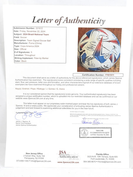 This is a hand autograph of 2024 Brazil National Team players Endrick/Pepe/Rodrygo/Joao Gomes/Guilherme Arana on an Puma Soccer Ball. This item has a James Spence Authentication, which comes with a JSA numbered hologram and a JSA Letter COA. It was signed either at a public autograph appearance or a private signing. This is a stock photo of the item. Although you may not receive this exact item, the item you receive is virtually identical and brand new in great shape. This is a hand autograph of 2024 Brazil National Team players Endrick/Pepe/Rodrygo/Joao Gomes/Guilherme Arana on an Puma Soccer Ball. This item has a James Spence Authentication, which comes with a JSA numbered hologram and a JSA Letter COA. It was signed either at a public autograph appearance or a private signing. This is a stock photo of the item. Although you may not receive this exact item, the item you receive is virtually identical and brand new in great shape.