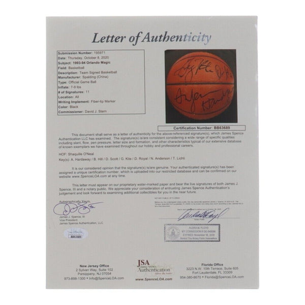 Spalding Official Game Ball NBA basketball has been hand-signed by Shaquille O'Neal (HOF), Anfernee "Penny" Hardaway, Dennis Scott, Nick Anderson, Brian Hill (Head Coach), Greg Kite, Tom Lichti, Donald Royal, Anthony Bowie, Bob Hill (Asst Coach) and Litterial Green.The autograph includes an official James Spence Authentication (JSA) hologram and matching LOA for authenticity purposes.Authentication: JSA LOA