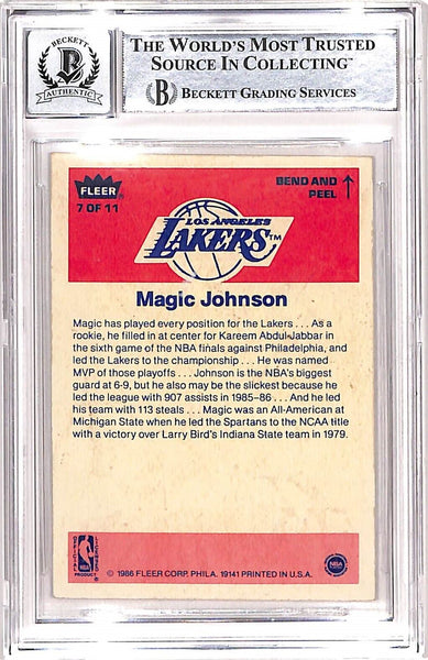 Magic Johnson Signed 1986 Fleer Sticker #7 Grade 10 Auto Card Beckett 38405 The number in the listing title is just an inventory sku for our records and is not the authentication number. The item pictured is the exact item you will receive, please see photos for condition. This is a 1986 Fleer Sticker numbered 7 of 11 Trading Card with a grade 10 autograph that was personally autographed by Magic Johnson. Includes a certificate of authenticity from Beckett Authentication Services (BAS) and Denver Autographs.
