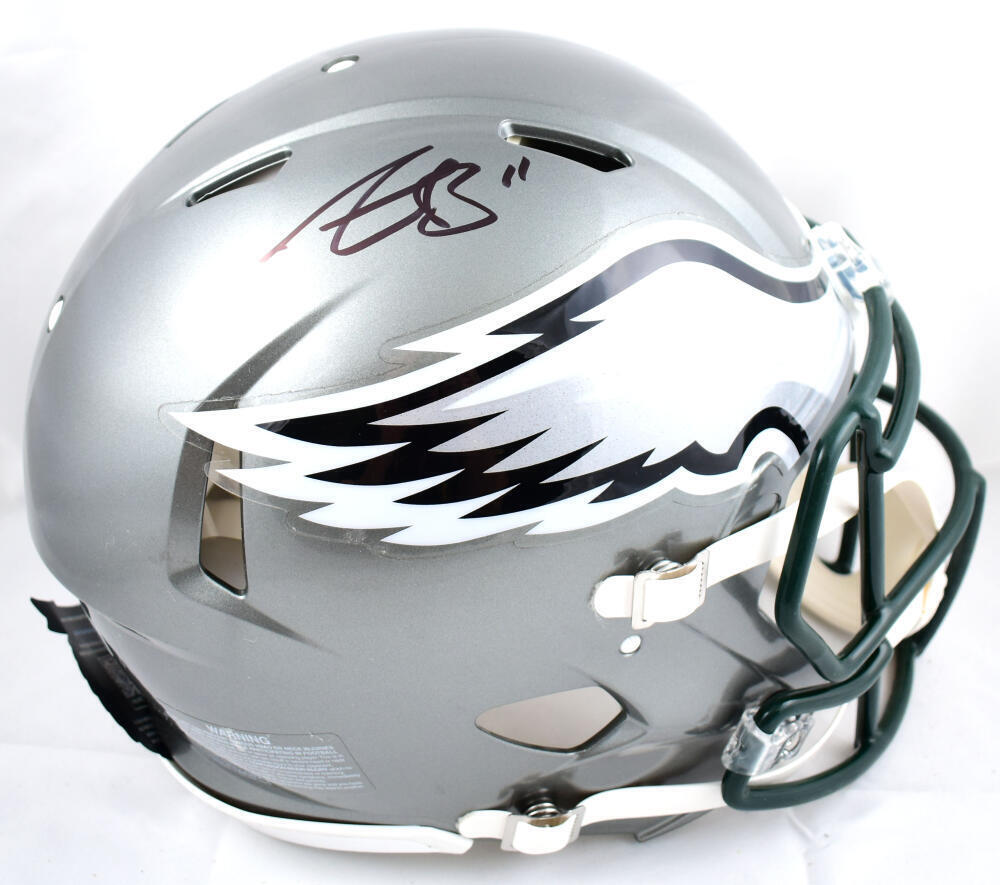 A.J. Brown Autographed Philadelphia Eagles F/S Flash Speed Authentic Helmet-Beckett W Hologram *Black This is a hand autographed Helmet of A.J. Brown of the Philadelphia Eagles. This is a Riddell Football Full Size Flash Speed Authentic Helmet. This item has a Beckett Witnessed Authentication, which comes with a numbered sticker hologram and a QR code for verification. You can view this item on the Beckett Authentication website, it shows when and where the item was signed. It was signed either at a public autograph appearance or a private signing. This is a stock photo of the item. Although you may not receive this exact item, the item you receive is virtually identical and brand new in great shape.
