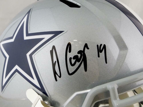 Amari Cooper Autographed Dallas Cowboys Speed Full Size Helmet- Beckett W Auth *Front This is a Hand Autograph of Amari Cooper of the Dallas Cowboys on a Riddell Football Speed Replica Full Size Helmet. This item has a Beckett Witness Authentication, which comes with a Beckett #'ed and a matching certificate of authenticity. You can view this item on the SpenceLOA website and it shows when and where the item was signed. It was signed either at a public autograph appearance or a Private Signing. This is a stock photo of the item. Although you may not receive this exact item, the item you receive is virtually identical and brand new in great shape.