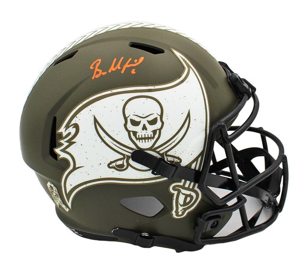 A Tampa Bay Buccaneers Speed Replica Salute To Service NFL Helmet hand signed by Baker Mayfield. The item and signature are in excellent condition. Baker was drafted into the NFL in 2018 round 1. Baker was PFWA ALL-Rookie Team, PFWA Rookie of the Year (2018), a Heisman Trophy, Maxwell Award, Walter Camp Award and the Davey O'Brien Award winner. AUTHENTICATION: This item is accompanied by a Beckett Serial Numbered and Databased Hologram