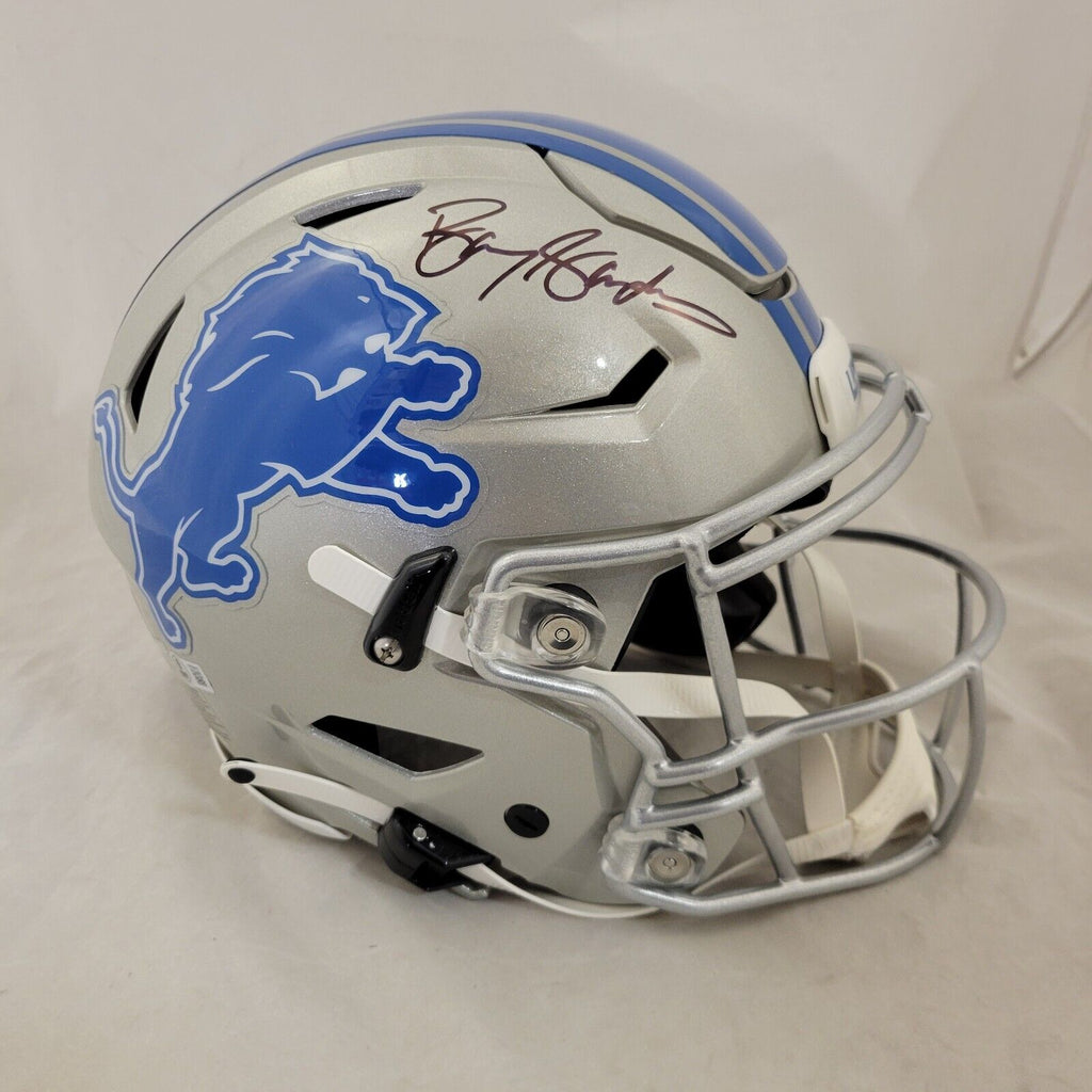 BARRY SANDERS AUTOGRAPHED DETROIT LIONS FULL SIZE SPEEDFLEX AUTHENTIC HELMETBECKETT QR HOLOGRAMTHIS MEANS THE HELMET WAS SIGNED WITH A BECKETT REPRESENTATIVE PRESENT SO YOU CAN BE 100% CERTAIN ITS THE REAL THING.