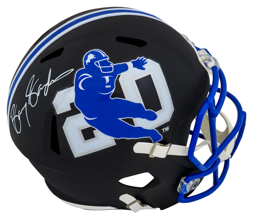 Barry Sanders signed Detroit Lions Barry Sanders logo black Riddell full size speed replica helmet. Item comes with a Schwartz Sports Memorabilia tamper-proof numbered hologram which can be verified online.