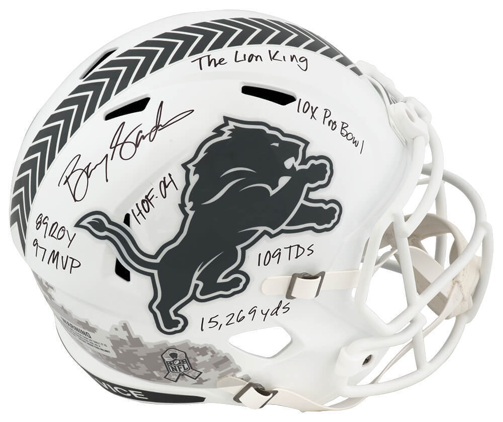 Barry Sanders signed Detroit Lions Salute 2024 white Riddell full size speed replica helmet with 'HOF 04, 89 ROY, 97 MVP, 15,269 yds, 109 TD, 10x Pro Bowl, The Lion King' inscriptions. Item comes with a Schwartz Sports Memorabilia tamper-proof numbered hologram and Certificate of Authenticity which can be verified online.