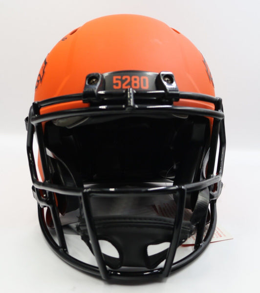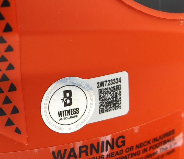 The product is an autographed Denver Broncos full-size Pro Speed helmet by Bo Nix. It is signed by Bo Nix and authenticated by Beckett Authentication Services (BAS). The helmet is an original, not a reprint, and features an orange rave design.