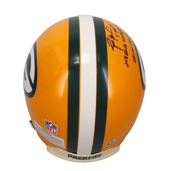This authentic Green Bay Packers proline helmet has been personally hand-signed by Brett Favre. This helmet is authenticated with the Brett Favre player hologram. These holograms can be verified online by its numbered hologram. This process helps to ensure that the product purchased is authentic and eliminates any possibility of duplication or fraud.This helmet is loaded with inscriptions that include:- 442 TD's- 61,655 Yds- SB XXXI Champs- MVP 3- 253 Starts 100% Guaranteed Authentic Features Tamper-Evident Favre Hologram Perfect Collector's Item MONEY BACK GUARANTEE! If for any reason you are not completely satisfied with the quality or authenticity of your purchase, we will gladly give you a full refund or exchange, whichever you prefer up to 30 days after purchase. Please feel free to e-mail us with any questions. GOOD LUCK BIDDING!!! Authenticator Pre-Certified Authenticator: Brett Favre Hologram History of item: Brett Favre signed this item in the presence of a representative from Favre Authentication Describe how you came to possess this item: Super Sports Center is a fully authorized dealer for Upper Deck Authenticated as well as Mounted Memories and Steiner Sports. Other information about you and / or the item: Super Sports Center strives to deliver the most authentic in sports memorabilia from trusted companies like Mounted Memories, Steiner Sports and Upper Deck Authenticated. If it exists, we can find it for you!