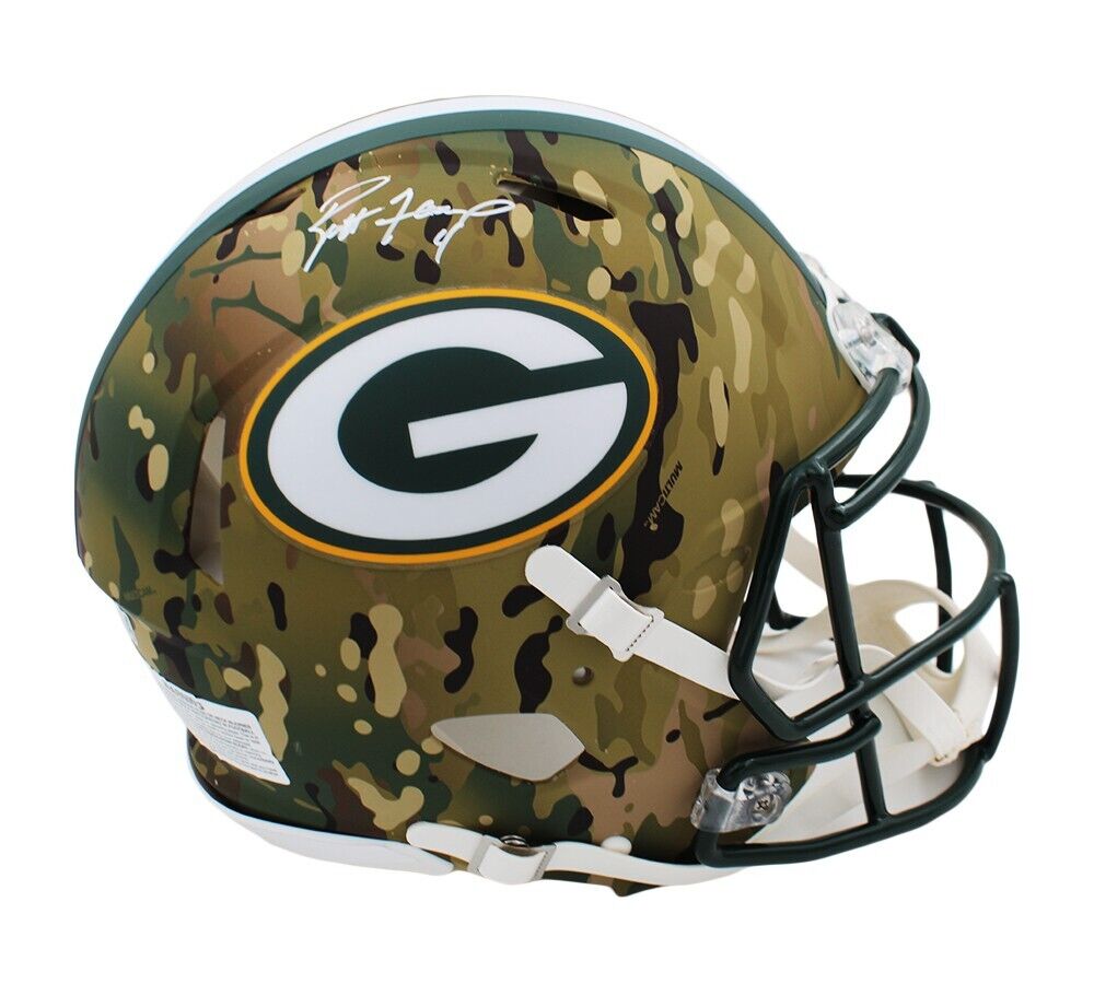 A Green Bay Packers Speed Authentic Camo NFL Helmet hand signed by Brett Favre. The item and signature are in excellent condition. Brett is one of the most iconic players in NFL history. A 20 year veteran of the NFL, Brett is a Super Bowl Champion, 11x Pro Bowler, 3x AP NFL Most Valuable Player, 4x NFL passing touchdowns leader, and 2x passing yards leader. His number, 4, has been retired by both the Green Bay Packers and the Southern Miss Golden Eagles. Brett was inducted into the Pro Football Hall of Fame in 2016. AUTHENTICATION: Your item has been tagged with a Brett Favre Exclusive SmarTag powered by Prova Technology, which gives you digital access to your items authentication records, including a proof picture from the signing.