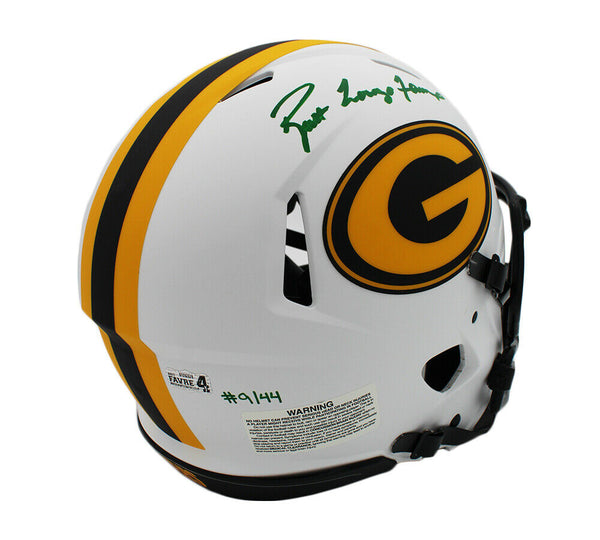 A Green Bay Packers Speed Authentic Lunar NFL Helmet hand signed by Brett Favre. The item and signature are in excellent condition. This is a Limited Edition of 44. Buyer will receive a random number from the edition. A 20 year veteran of the NFL, Brett is a Super Bowl Champion, 11x Pro Bowler, 3x AP NFL Most Valuable Player, 4x NFL passing touchdowns leader, and 2x passing yards leader. His number, 4, has been retired by both the Green Bay Packers and the Southern Miss Golden Eagles. Brett was inducted into the Pro Football Hall of Fame in 2016. AUTHENTICATION: The item is accompanied by a Brett Favre Exclusive Certificate of Authenticity - Brett Favre Exclusive Serial Numbered and Databased Hologram - Picture of Brett from the signing