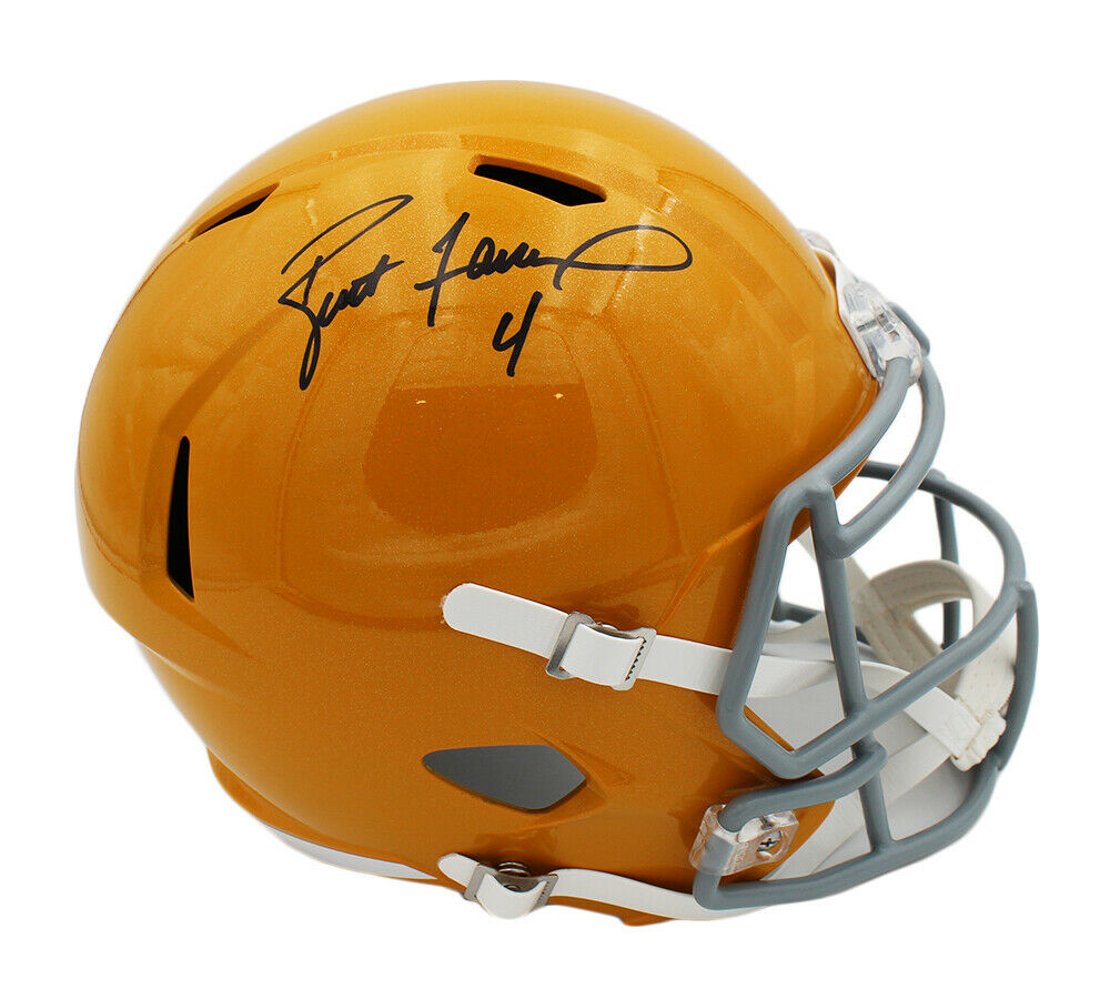 A Green Bay Packers Speed Replica 1950's Throwback NFL Helmet hand signed by Brett Favre. The item and signature are in excellent condition. A 20 year veteran of the NFL, Brett is a Super Bowl Champion, 11x Pro Bowler, 3x AP NFL Most Valuable Player, 4x NFL passing touchdowns leader, and 2x passing yards leader. His number, 4, has been retired by both the Green Bay Packers and the Southern Miss Golden Eagles. Brett was inducted into the Pro Football Hall of Fame in 2016. AUTHENTICATION: The item is accompanied by a Brett Favre Exclusive Certificate of Authenticity - Brett Favre Exclusive Serial Numbered and Databased Hologram - Picture of Brett from the signing