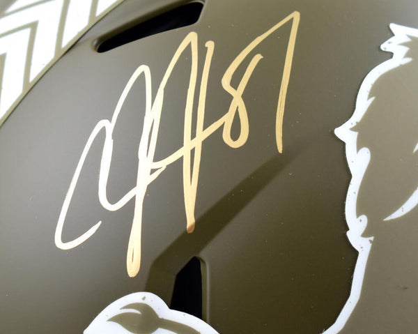 Calvin Johnson Autographed Detroit Lions F/S Salute to Service Speed Authentic Helmet- Beckett W Hologram *Gold This is a Calvin Johnson of the Detroit Lions hand autographed Riddell Full Size Salute to Service Speed Authentic Helmet. This item has a Beckett Witnessed Authentication and comes with a numbered hologram and a QR code for verification. You can view this item on the both the Beckett Authentication website, it shows when and where the item was signed. It was signed either at a public autograph appearance or a private signing. This is a stock photo of the item. Although you may not receive this exact item, the item you receive is virtually identical, brand new, and in great shape.