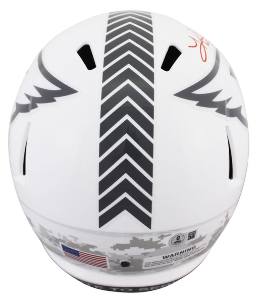 This Autographed Alternate 2024 Salute To Service III Riddell Full Size Speed Rep Helmet has been Personally Signed by Kurt Warner of the Arizona Cardinals. This item is 100% Authentic to include a hologram by Beckett Authentication Services. This item will come with an affixed Beckett Authentication Services (BAS) authentication sticker, which includes a scannable QR code to verify authenticity. Please note that Beckett no longer provides serial-numbered COA cards, and the attached BAS sticker will serve as the complete authentication for this item. This is a BAS Witnessed Protection Program item which means a Beckett Authentication Service representative was present when this item was being signed. We conducted an autograph signing with Kurt Warner where multiples of the same item were signed. While the photographs are representative of this item, the size, placement and strength of the signature may vary. Each item is hand signed, therefore, each autograph is unique. This item can be verified through BAS Witnessed.