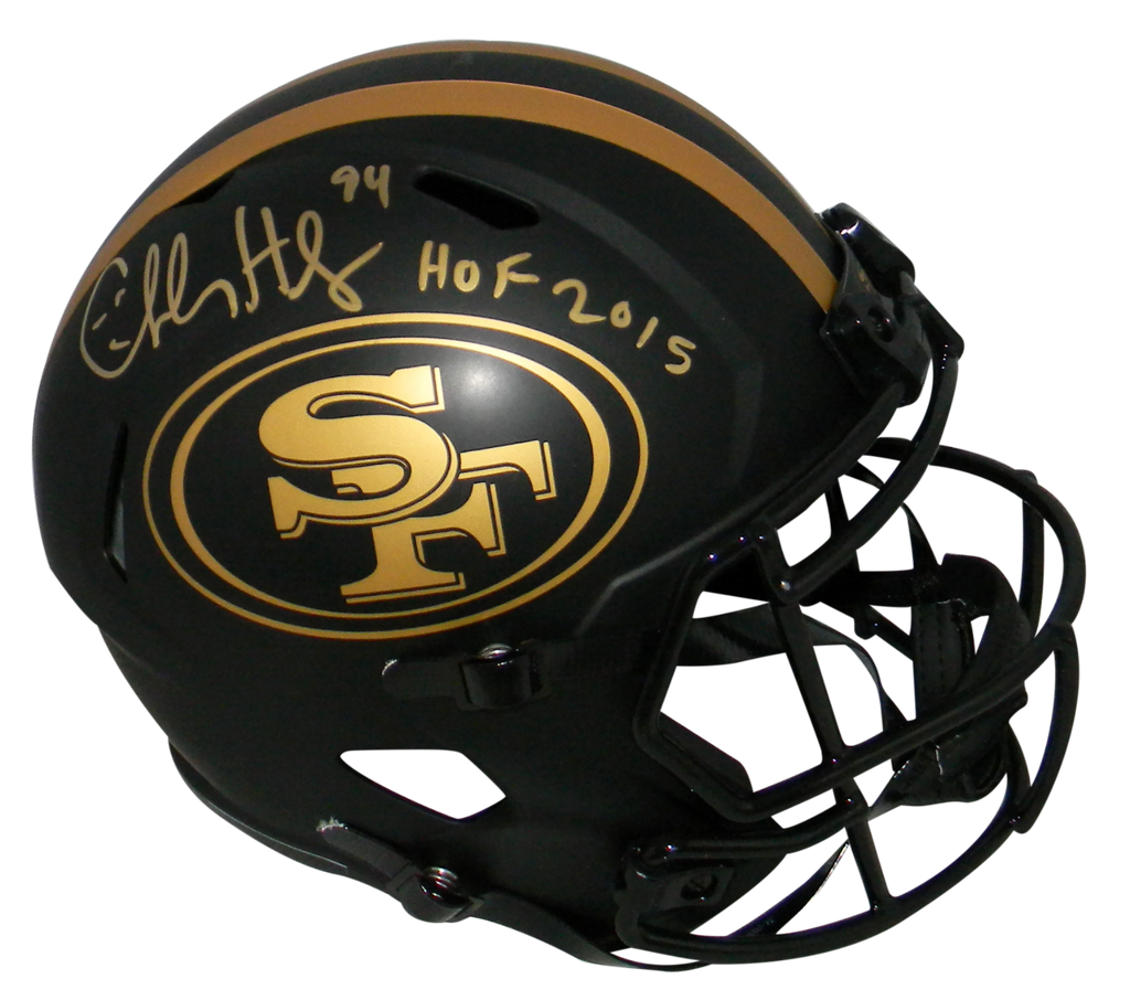 Charles Haley, former Hall of Fame defensive end for the San Francisco 49ers, has hand signed this 49ers Riddell Speed Eclipse full-size replica helmet at a private signing. He included the inscription "HOF 2015". This item comes with a certificate of authenticity (COA) from Beckett Authentication Services and was signed in the presence of one of their representatives. You will receive a serial-numbered COA along with a matching serial-numbered sticker on the helmet. The authenticity can be verified online by entering the serial number.Item pictured may not be the exact item you will receive. It will be similar quality, and we guarantee your satisfaction.