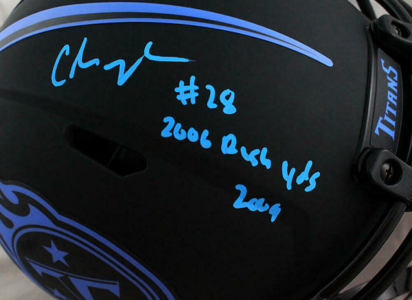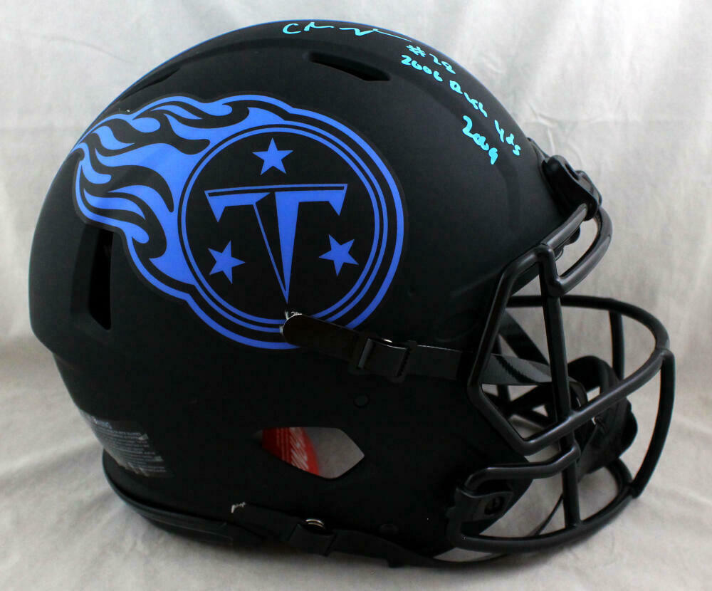 Chris Johnson Autographed Tennessee Titans F/S Eclipse Speed Authentic Helmet w/ Insc- Beckett W Auth This is a hand autographed Helmet of Chris Johnson of the Tennessee Titans. This is a Riddell Football Full Size Eclipse Speed Authentic Helmet. This item is inscribed with 2006 Rushing Yards, 2009.This item has a Beckett Witnessed Authentication, which comes with a numbered sticker and a matching Beckett Certificate of Authenticity. You can view this item on the Beckett Authentication website, it shows when and where the item was signed. It was signed either at a public autograph appearance or a private signing. This is a stock photo of the item. Although you may not receive this exact item, the item you receive is virtually identical and brand new in great shape.