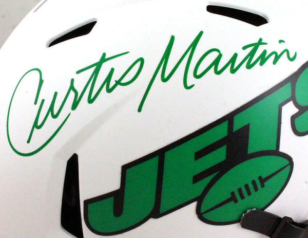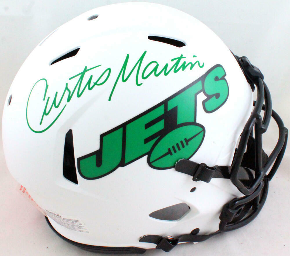Curtis Martin Signed NY Jets F/S Lunar Authentic Helmet- PSA/DNA *Green This is a Curtis Martin of the New York Jets hand autographed Riddell Full Size Lunar Speed Authentic Helmet. This item has a PSA/DNA Authentication, which comes with a numbered sticker and a matching Certificate of Authenticity. You can view this item on the PSA/DNA Authentication website. It was signed either at a public autograph appearance or a private signing. This is a stock photo of the item. Although you may not receive this exact item, the item you receive is virtually identical, brand new, and in great shape.