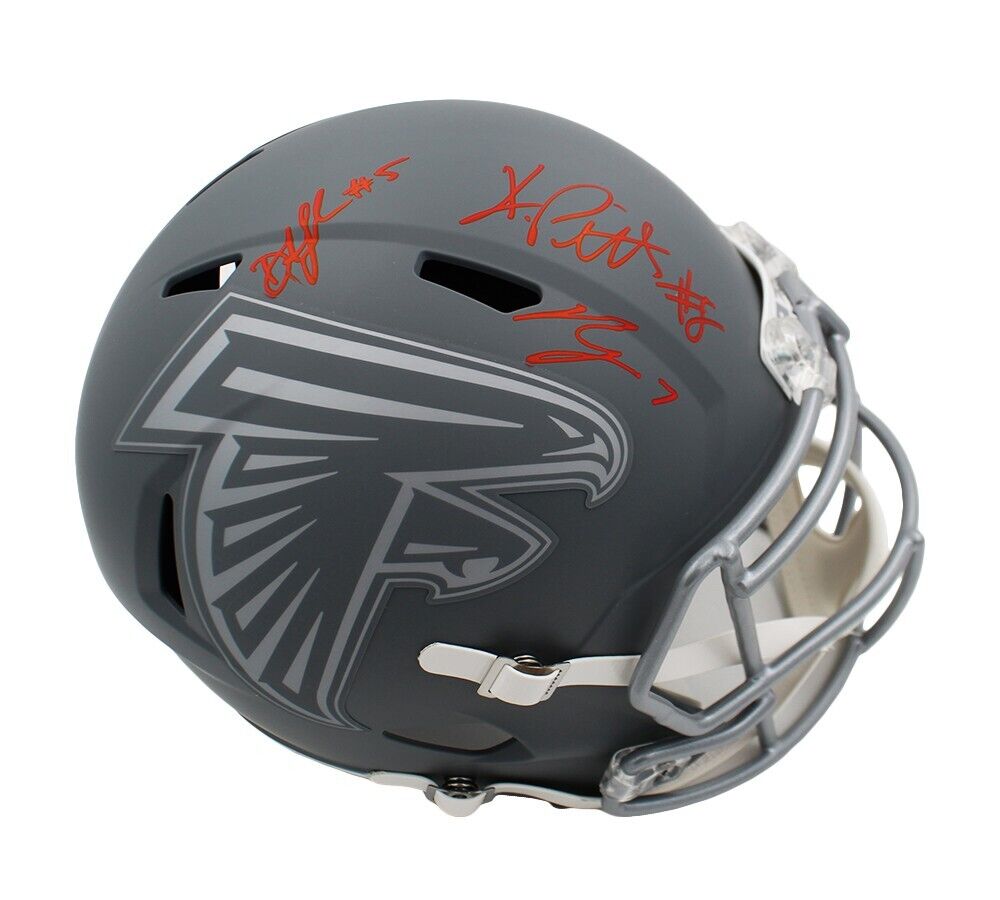 An Atlanta Falcons Speed Replica Slate NFL Helmet hand signed by Drake London, Kyle Pitts & Bijan Robinson. The item and signature are in excellent condition. AUTHENTICATION: Your item is tagged with a SmarTag Powered by Prova Technology, which gives you digital access to your items authentication records, including a proof picture from the signing.
