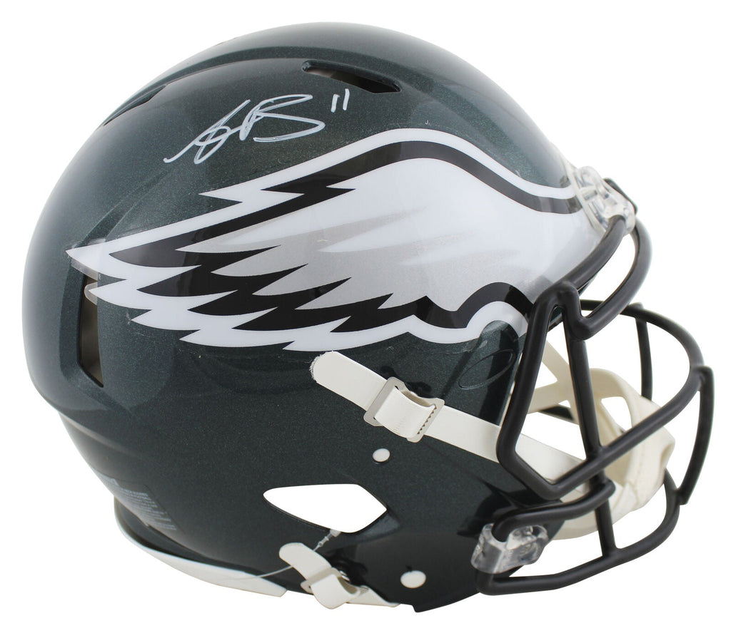 This Autographed Authentic Full Size Speed Proline Helmet has been Personally Signed by A.J. Brown of the Philadelphia Eagles. This item is 100% Authentic to include a hologram by Beckett Authentication Services. This item will come with the new Beckett Authentication hologram that has a scannable QR code rather than the traditional COA. If you would like to have a COA, you are welcome to reach out to Beckett for a printed certification once you receive your item. This is a BAS Witnessed Protection Program item which means a Beckett Authentication Service representative was present when this item was being signed. We conducted an autograph signing with A.J. Brown where multiples of the same item were signed. While the photographs are representative of this item, the size, placement and strength of the signature may vary. Each item is hand signed, therefore, each autograph is unique. This item can be verified through BAS Witnessed.